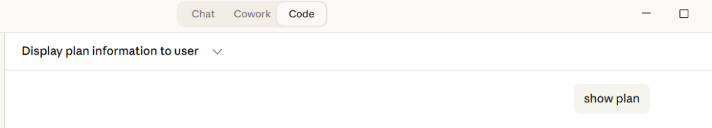 Als nächste wird die Claude App geöffnet, wechsel ins Register Code und den Befehl „show plan“ ausführen.